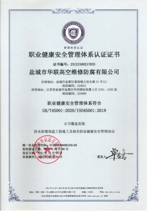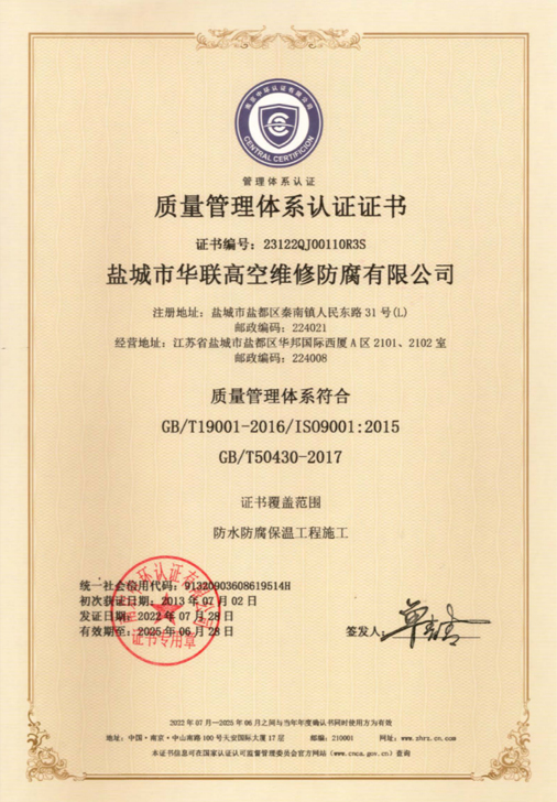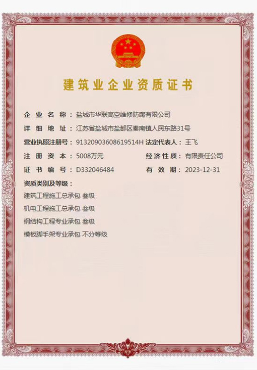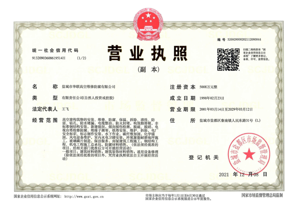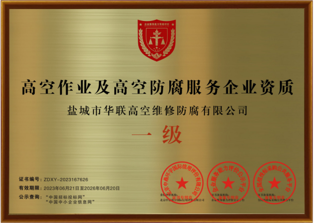 鹽城市華聯(lián)高空維修防腐有限公司始建于上世紀(jì)八十年代,系專業(yè)從事風(fēng)力發(fā)電機(jī)塔筒防腐,塔筒維護(hù),塔筒補(bǔ)漆,塔筒噴字等工程。不停產(chǎn),不搭手架,高空懸吊施工的一級高空安全資質(zhì)、一級高空防腐施工資質(zhì)、二級建筑施工資質(zhì)的高空建修、防腐工程、公司。現(xiàn)已發(fā)展集科研、設(shè)計、施工為一體的的江蘇省較大的高空建修,高空防腐施工企業(yè);公司注冊資金3008萬元,流動資金8000多萬元;擁有高修技術(shù)科研高修工程設(shè)計、高修工程施工三大技術(shù)與施工組織體系;公司擁有一流的技術(shù)施工隊伍,其中有高級職稱36 名,中級職稱126人。具備一級防腐資質(zhì)、一級安全資質(zhì)及二級建筑資質(zhì),公司下轄五個分公司和十八個辦事處,為全國數(shù)百家企業(yè)解決了若干“高、大、難”的特殊工程項目,填補(bǔ)了我國建筑史上的空白。